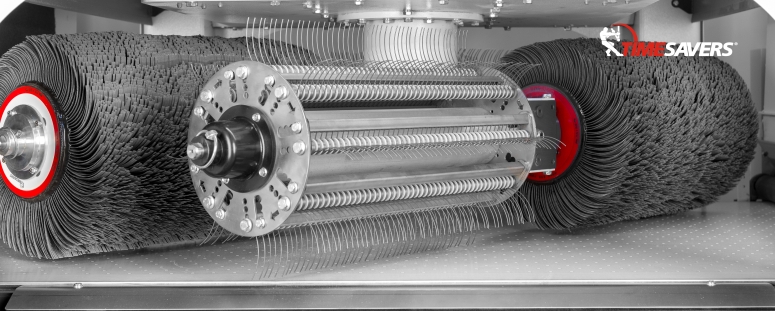 Timesavers is proud to show the latest version of the compact rotary brush machine: the 32 HWRB series. Not only has the rotary brush carousel been optimised, but the machine also has an additional feature: the Hammerhead. The popular rotary brush technique is the ultimate solution for creating a uniform radius on all edges of sheet metal parts up to a width of 1100 mm. It is even possible to combine edge rounding with the removal of oxide skin on steel parts. The 32 series HWRB will be equipped with a dust extractor Timesavers x Absaugwerk.