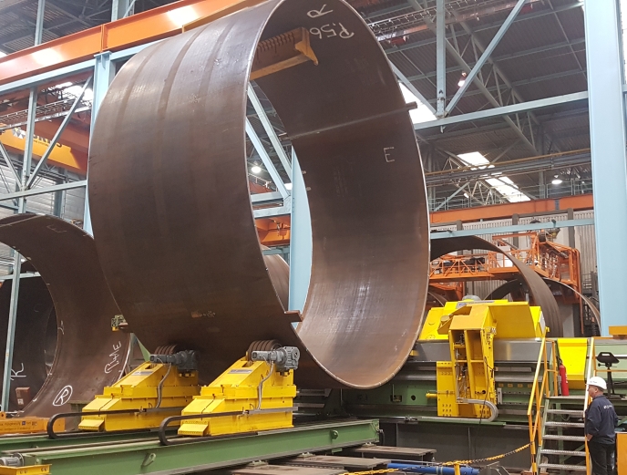 The monopiles for wind towers are always assembled from several individual cylindrical and conical steel rings, the so-called pipe shells. Typical dimensions for such a pipe shell are a diameter of 13 meters and maximum lengths of 4 meters. With wall thicknesses of 120 mm, this results in an individual weight of up to 150 tons per pipe shell. After bending, the pipe shells are first welded longitudinally from the inside and then from the outside. This is followed by the assembly of up to 6 sections into one section. 3 to 4 of these assembled sections form the so-called monopile. A monopile has a total of approx. 192 m longitudinal and 940 m circumferential welds and a total weight of up to 2,500 tons.