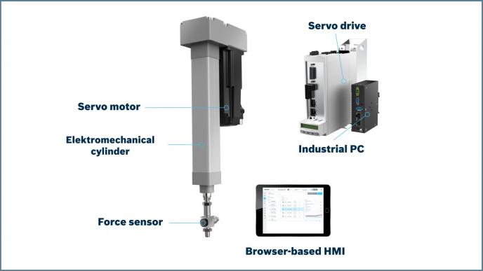 The easy, fast and attractively priced kit has been specially designed for pressing and joining functions in the force range of 2 to 30 kN. The modular system consists of hardware and software components: electromechanical cylinder and power sensor, servo motor, drive controller, industrial PC and browserbased HMI software based on HTML 5.