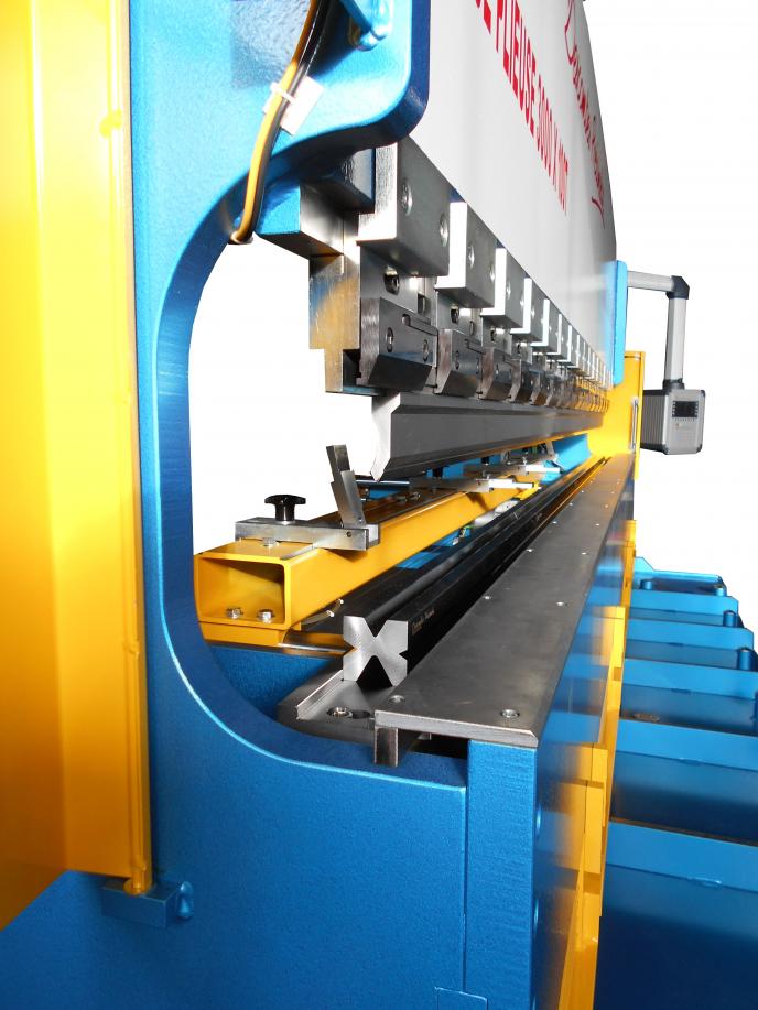 A PRESS BRAKE function on the upper part, with a capacity of 3MX100T (5mm steel) and a working height of 1290mm. The CNC controls gauge retraction (axe X) and bending depth (axe Y), as well as the sequence of folds with different dimensions and angles. The calculation and adjustment of the automatic bending power is made by proportional distributors.