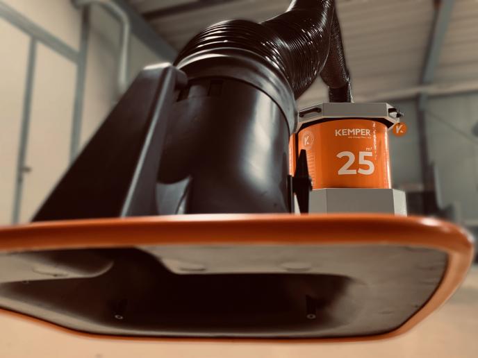 While the optimised design of the extraction hood in the original equipment already makes less tracking necessary, the new KEMPER extraction hood available at the end of the year in the extended version in combination with the new 180 millimeter extraction arm ensures an even higher capture rate. The SmartFil is already designed for these additional accessories: KEMPERbeats, a Bluetooth loudspeaker for playing your own music, an LED strip and the integrated volume flow monitoring also make welding work even safer and more pleasant.KEMPER is also setting new standards in terms of design with the SmartFil. Like many comparable models, the extraction unit is no longer square but round. This is possible because – for the first time in this device class – KEMPER has integrated a round storage filter. As part of the housing, welders can easily remove this SafeChangeFilter from the extraction unit. This means that its disposal is completely contamination free.