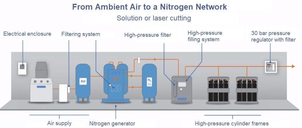 • Nitrogen or oxygen gas is essential for operating CO2 or fibre laser cutting machines. So how do you make the right choice when it comes to the gas, purity, cylinder or tank storage, procurement, network installation and gas generator?.Indeed, manufacturers sometimes make decisions about gas supply in haste. Yet, it is important to take your time when considering the network installation, gas solution and supplier, in order to make the most optimal decision.